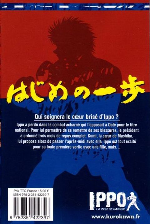 Qui soignera le coeur brisé d'Ippo ? Ippo a perdu son combat acharné qui l'opposait à Date pour le titre national. Pour lui permettre de se remettre de ses blessures, le Président a ordonné trois mois de repos complet. Kumi, la soeur de Mashiba, lui propose alors de passer l'après midi avec elle. Ippo est tout excité pour sa toute première sortie avec une fille, mais...