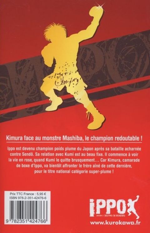 Kimura face au monstre Mashiba, le Champion redoutable ! Ippo est devenu Champion poids plume du Japon après sa bataille acharnée contre Sendô. Sa relation avec Kumi est au beau fixe et il commence à voir la vie en rose. Mais Kumi le quitte brusquement... c'est parce que son ami Kimura va bientôt affronter Mashiba, le frère aîné de Kumi, pour le titre national catégorie super-plume !