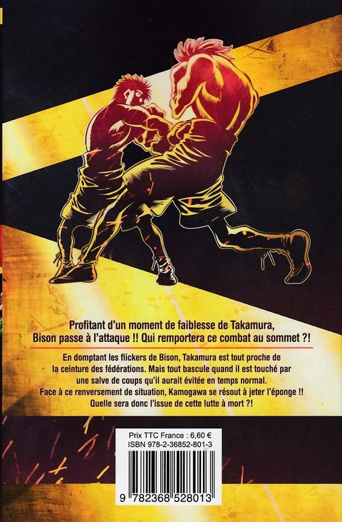 En domptant les flickers de Bison, Takamura est tout proche de la ceinture des fédérations. Mais tout bascule quand il est touché par une salve de coups qu'il aurait évitée en temps normal. Face à ce renversement de situation, Kamogawa se résout à jeter l'éponge !! Quelle sera donc l'issue de cette lutte à mort ?!