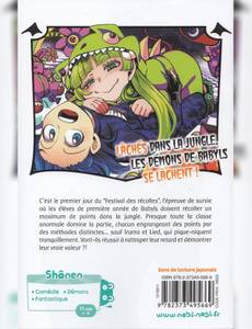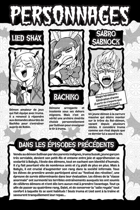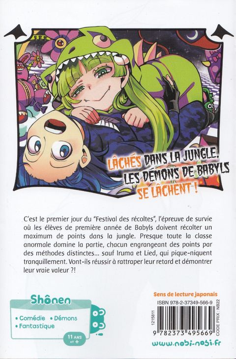 <div style="text-align: justify;">Lâchés dans la jungle, les démons de Babyls se lâchent ! C’est le premier jour du “Festival des récoltes”, l’épreuve de survie où les élèves de première année de Babyls doivent récolter un maximum de points dans la jungle. Presque toute la classe anormale domine la partie, chacun engrangeant des points par des méthodes distinctes... sauf Iruma et Lied, qui pique-niquent tranquillement. Vont-ils réussir à rattraper leur retard et démontrer leur vraie valeur ?!</div>