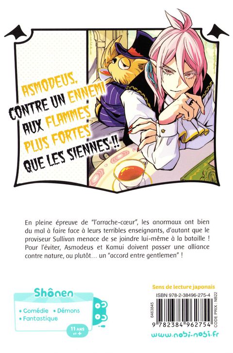 Asmodeus, contre un ennemi aux flammes plus fortes que les siennes !!En pleine épreuve de “l’arrache-cœur”, les anormaux ont bien du mal à faire face à leurs terribles enseignants, d’autant que le proviseur Sullivan menace de se joindre lui-même à la bataille ! Pour l’éviter, Asmodeus et Kamui doivent passer une alliance contre nature, ou plutôt… un “accord entre gentlemen” !