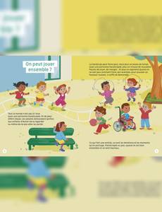 Avoir un copain handicapé, ça veut dire quoi ? Ça veut dire quoi physiquement, pourquoi il est malade et pas moi ?, Qu'est-ce qui se passe dans son corps ? Et ça veut dire quoi dans la vie de tous les jours ? Pourquoi peut-il être rejeté ? Comment dois-je me comporter avec lui ? Tout autant de questions difficiles qui peuvent tarauder les petits. Ce titre répond à ces question de manière ludique et à hauteur d'enfant, grâce à : - une ouverture et fermeture de thématique par une petite planche BD. - Une double page par question d'enfant. - Et une double page récapitulative « Alors finalement, je fais comment ? » par un expert du domaine