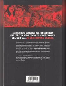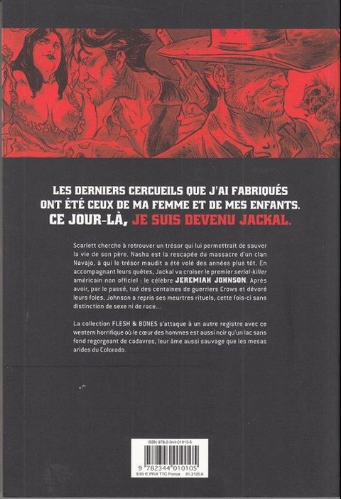 « J'étais croque-mort. Mes derniers cercueils ont été ceux de ma femme et de mes enfants. Ce jour-là, je suis devenu Jackal. »Mercenaire sans foi ni loi, Jackal n'a qu'une faiblesse : les jolies femmes. Il y en a justement deux qui allient jeunesse, beauté et caractère : Scarlett et Nasha. Scarlett cherche à retrouver un trésor qui lui permettrait de sauver la vie de son père. Nasha est la rescapée du massacre d'un clan Navajo, à qui le trésor maudit a été volé des années plus tôt. En accompagnant leurs quêtes, Jackal va également croiser le premier serial killer américain non officiel : le célèbre Jeremiah Johnson. Après avoir, par le passé, tué des centaines de guerriers Crows et dévoré leurs foies, Johnson a repris ses meurtres rituels, cette fois-ci sans distinction de sexe ni de race...La collection « Flesh & Bones » s'attaque à un autre registre avec ce western gore où le coeur des hommes est aussi noir qu'une nuit sans lune ; leur âme aussi sauvage que les plaines arides de l'Ouest.