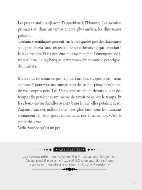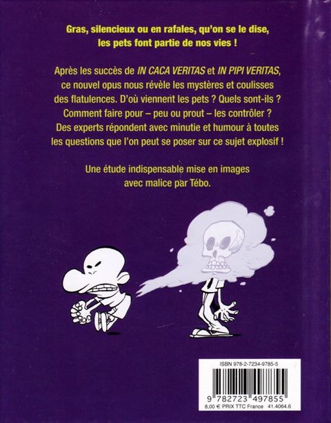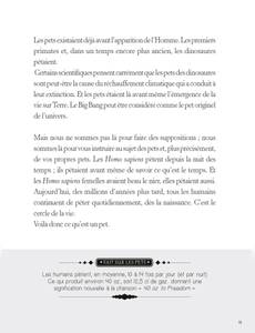 Prout, perle, caisse, pet, vent, renard... appelez ça comme vous voulez, tout le monde pète. Alors pourquoi tant d'ignorance et de tabous à propos de ce phénomène universel ? Rassurez-vous, Je pète donc je suis est là ! Grâce à ce petit ouvrage savant de Ben Applebaum et Dan DiSorbo, joyeusement illustré par Tebo - dans la continuité du titre à succès In caca veritas - apprenez tout ce qu'il y a à savoir sur ce sujet dense et passionnant, au potentiel comique détonant : de son histoire aux prouesses techniques les plus élaborées, avec en bonus une liste de films (comme Autant en emporte le vent, Apocalypse now, Certains l'aiment chaud.) et de chansons (Light my fire, Boom Boom, Oops !... I did it again...) aux titres pour le moins évocateurs et qui peuvent être perçus comme autant de clins d'oeil humoristiques à la thématique du pet. Le cadeau « fun », idéal à faire à toute période de l'année !Car quoi qu'on en dise, le pet, c'est beaucoup plus qu'un simple gaz intestinal odorant et/ou sonore qu'on expulse. C'est un véritable concept, un savoir-faire, une technique, une culture, que dis-je... c'est un art !