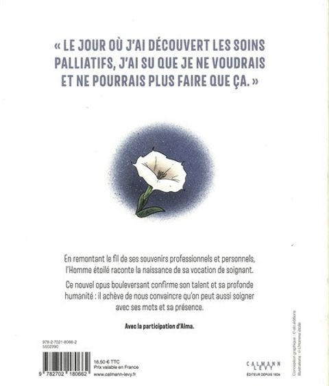 " Le jour où j'ai découvert les soins palliatifs, j'ai su que je ne voudrais et ne pourrais plus faire que ça." En remontant le fil de ses souvenirs professionnels et personnels, l’Homme étoilé raconte la naissance de sa vocation de soignant. Ce nouvel opus bouleversant confirme son talent et sa profonde humanité: il achève de nous convaincre qu’on peut aussi soigner avec ses mots et sa présence. Avec la participation d’Alma.