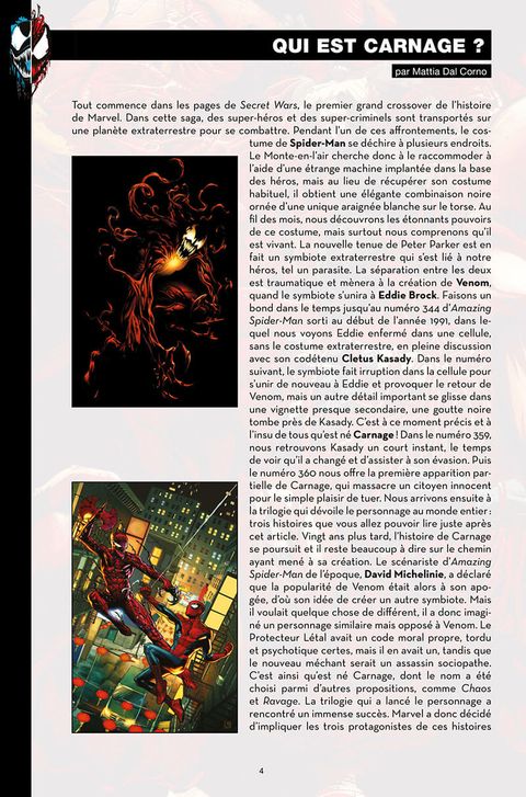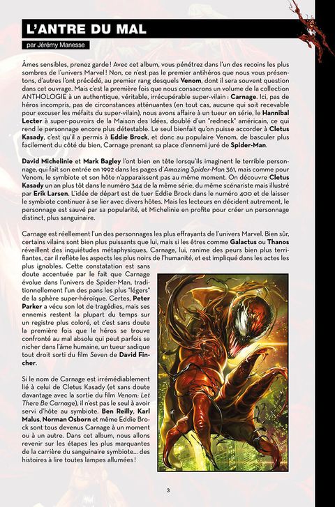 Retrouvez une sélection d'épisodes qui vous permettront de plonger dans l'un des esprits les plus dérangés de l'univers de la Maison des Idées : celui de Cletus Kasady et de son symbiote Carnage ! A chaque sortie de film, Panini Comics propose aux lecteurs une anthologie permettant de découvrir le personnage central du long-métrage. Pour Venom 2, le principal méchant est le symbiote Carnage, l'un des vilains les plus iconiques de l'univers de Spider-Man. En parallèle de la réimpression de Nous sommes Venom, les fans pourront ainsi découvrir le super-vilain du film !