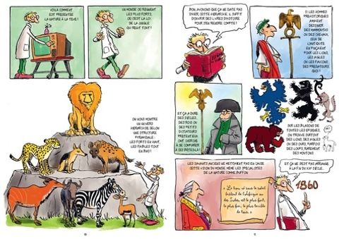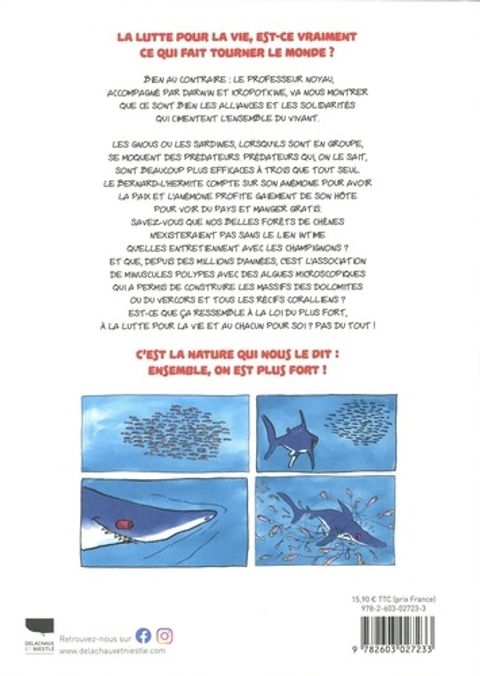 La lutte pour la vie, est-ce vraiment ce qui fait tourner le monde ? Bien au contraire : le professeur Noyau, accompagné par Darwin et Kropotkine, va nous montrer que ce sont bien les alliances et les solidarités qui cimentent l'ensemble du vivant. Les gnous ou les sardines, lorsqu'ils sont en groupe, se moquent des prédateurs. Prédateurs qui, on le sait, sont beaucoup plus efficaces à trois que tout seul. Le bernard-l'hermite compte sur son anémone pour avoir la paix et l'anémone profite gaiement de son hôte pour voir du pays et manger gratis. Savez-vous que nos belles forêts de chênes n'existeraient pas sans le lien intime qu'elles entretiennent avec les champignons ? Et que, depuis des millions d'années, c'est l'association de minuscules polypes avec des algues microscopiques qui a permis de construire les massifs des Dolomites ou du Vercors et tous les récifs coralliens ? Est-ce que ça ressemble à la loi du plus fort, à la lutte pour la vie et au chacun pour soi ? Pas du tout ! C'est la nature qui nous le dit : ensemble, on est plus fort !