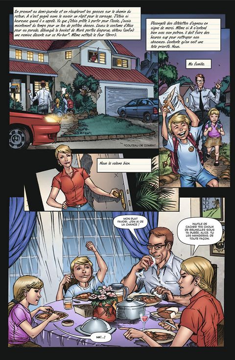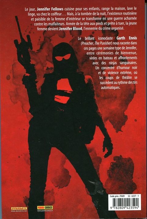 Pour le plus grand bonheur des fans, le mois d'avril sera riche en nouvelles séries. Celle-ci vient de chez Dynamite, elle est signée Garth Ennis, l'auteur de The Boys, elle est trash mais n'oublie pas aussi d'être fun. Un vrai régal. Nous allons donc suivre les aventures de Jennifer Blood, une mère de famille on ne peut plus respectable, qui emmène ses enfants à l'école, fait le ménage, prépare le dîner, embrasse son mari avant de se coucher. puis fait le mur pour massacrer des criminels. Un grand moment d'humour noir en perspective.