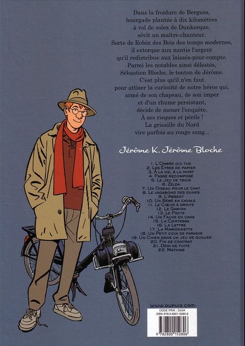 Dans la froidure de Bergues, bourgade plantée à dix kilomètres à vol de solex de Dunkerque, sévit un maître chanteur. Sorte de Robin des Bois des temps modernes, il extorque aux nantis l'argent qu'il redistribue aux laissés-pour-compte. Parmi les notables ainsi délestés, Sébastien Bloche, le tonton de Jérôme. C'est plus qu'il n'en faut pour attiser la curiosité de notre héros qui, armé de son chapeau, de son imper et d'un rhume persistant, décide de mener l'enquête. À ses risques et périls ! La grisaille du Nord vire parfois au rouge sang...