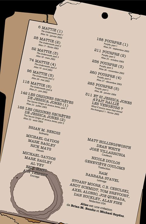 Alors que Jessica Jones enquête sur la disparition de Mattie Franklin, la dernière Spider-Woman, nous en apprenons plus sur le passé de la détective. Ancienne super-héroïne, son affrontement avec Kilgrave, l'Homme-Pourpre, a laissé de lourdes séquelles. (Contient les épisodes US Alias 16-28 et What If (2005) 1, publiés précédemment dans les albums MARVEL MAX : ALIAS 4-5 ou MARVEL OMNIBUS: ALIAS et MARVEL MEGA 23)