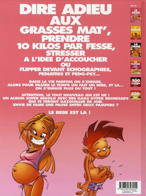 Le nouveau grand éclat de rire signé Jim On ne présente plus Mickey et Lisa, dont Jim suit les ébats sentimentaux depuis quelques albums aussi réussis que Le désir ou L'amour. Mais maintenant fini de rire, car nos deux trentenaires veulent un bébé ! Heureusement le lecteur, lui, n'a pas fini de se marrer... Nostalgie des grasses matinées. Disparition soudaine de tous les copains fêtards. Couches odorantes. Dissolution de l'harmonie sexuelle du couple. Mickey et Lisa vont sombrer dans un enfer de guimauve... et de responsabilités. Dressant un vaste panorama des grands bonheurs et des petites angoisses des jeunes parents, Jim parle du délicat passage de l'adolescence prolongée à la soudaine vie d'adulte et fait à nouveau p reuve d'un sens de l'observation aigu et caustique qui devrait trouver un écho en chacun de ses lecteurs. Un album tendre et amusant qui ravira les jeunes parents et mettra au parfum ceux qui songent à le devenir. Ces derniers ne pourront pas dire que Jim ne les avait pas prévenus !