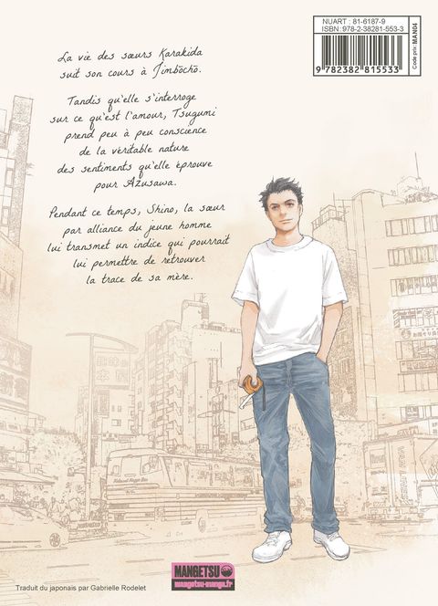La vie des soeurs Karakida suit son cours à Jimbocho;Tandis qu'elle s'interroge sur ce qu'est l'amour, Tsugumi prend peu à peu conscience de la véritable nature des sentiments qu'elle éprouve pour Azusawa. Pendant ce temps, Shino, la soeur par alliance du jeune homme lui transmet un indice qui pourrait lui permettre de retrouver la trace de sa mère.Après Sing Yesterday For Me et Les Mystères de Taishô, Kei Toume revient avec Jimbôchô Sisters, une comédie aux personnages féminins haut en couleurs dans le célèbre quartier japonais de Jimbôchô.