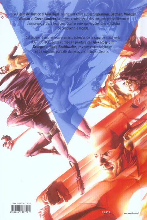 La Ligue de Justice d'Amérique, réunissant entre autres Superman, Batman, Wonder Woman et Green Lantern, se trouve confrontée à des ennemis particulièrement dangereux, prêts à tout pour écarter ceux qui voudront les empêcher de conquérir le monde. Cet album réunit les trois premiers épisodes de la superbe maxi-série JLA : JUSTICE, écrite et mise en peinture par Alex Ross, Jim Krueger et Doug Braithwaite, les couvertures originales et de superbes portraits de héros et criminels célèbres.
