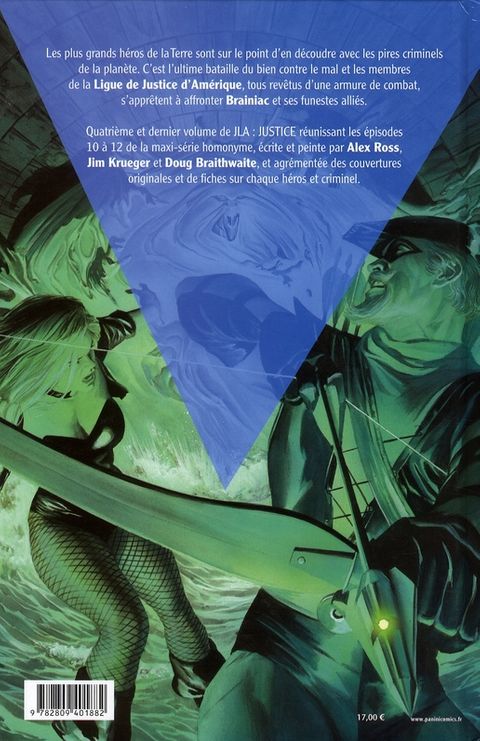 Les plus grands héros de la Terre sont sur le point d'en découdre avec les pires criminels de la planète. C'est l'ultime bataille du bien contre le mal et les membres de la Ligue de Justice d'Amérique, tous revêtus d'une armure de combat, s'apprêtent à affronter Brainiac et ses funestes alliés. Quatrième et dernier volume de JLA : JUSTICE réunissant les épisodes 10 à 12 de la maxi-série homonyme, écrite et peinte par Alex Ross, Jim Krueger et Doug Braithwaite, et agrémentée des couvertures originales et de fiches sur chaque héros et criminel.