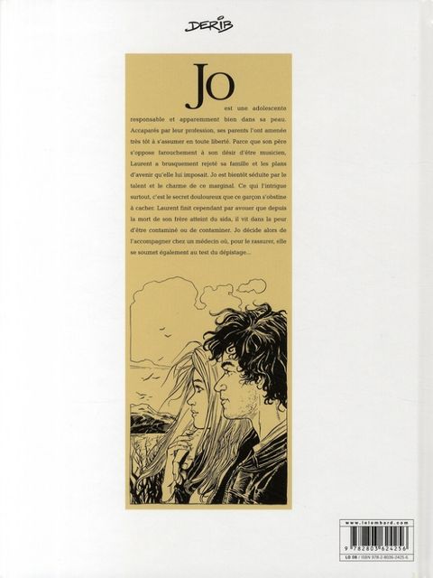 Jo est une adolescente responsable et apparemment bien dans sa peau. Accaparés par leur profession, ses parents l'ont amenée très tôt à s'assumer en toute liberté. Rien, si ce n'est la nécessité de préserver sa jeune soeur des mauvaises fréquentations, ne la prédestinait à connaître Laurent. Parce que son père s'oppose farouchement à son désir d'être musicien, celui-ci a brusquement rejeté sa famille et les plans d'avenir qu'elle lui imposait. Jo est bientôt séduite par le talent et le charme de ce marginal. Ce qui l'intrigue surtout, c'est le secret douloureux que ce garçon s'obstine à cacher... Une réédition qui s'imposait... Parce que le sida se soigne, mais ne se guérit toujours pas. Parce que par son traitement graphique et narratif exemplaire, cette poignante tragédie signée Derib est aussi l'une des réalisations les plus attachantes de la BD.