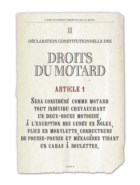80 pages de trucs et astuces de oufs pour devenir un as de la moto !Il ne suffit pas d'avoir une moto pour être motard ! Encore faut-il connaître le jargon des spécialistes, leurs us et coutumes ainsi que tous les petits détails indispensables à la survie en deux-roues. Comment éviter un radar ? Qu'est-ce qu'une meule qui pousse velu ? Comment reconnaître un Pur d'un Poireau ? Autant de questions essentielles qui trouveront réponse grâce à cette Encyclopédie Imbécile que l'on est prié, si l'on est un vrai motard, de lire avec les mains graisseuses et la visière baissée. Présentée sous un nouveau format et une nouvelle maquette, la grande oeuvre de Bidault et Bar2 est un pur dérapage contrôlé dans l'humour made in Joe Bar Team, mais aussi un pur ouvrage de passionné, qui fera ronronner de plaisir les adeptes de grosses cylindrées.