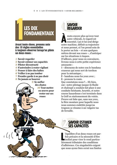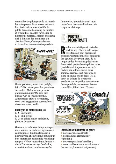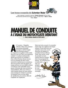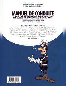 Un ouvrage pédagogique et humoristique conçu par des pros du guidon. Comme l'indique son titre, ce guide, véritable bible du motard, s'adresse en premier lieu aux usagers débutants... « ainsi qu'aux poireaux et minables de toute sorte », ajoutent ses auteurs. Et quels auteurs ! Bar2, le papa de Joe Bar Team (célèbre BD dédiée au folklore motard), et « Lévrier Noir », alias Denis Couvent, éminent formateur des brigades motorisées d'Île de France, ont associé leur talent pour réunir dans cet ouvrage tout ce qu'un bon motard doit savoir avant d'enfourcher son bolide. Gageons que ces 130 pages de conseils et astuces, illustrées de nombreux dessins issus des albums de Fane et Bar2, sauront passionner le lecteur et l'initieront avec humour aux très sérieuses choses de la route.