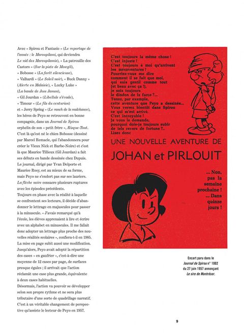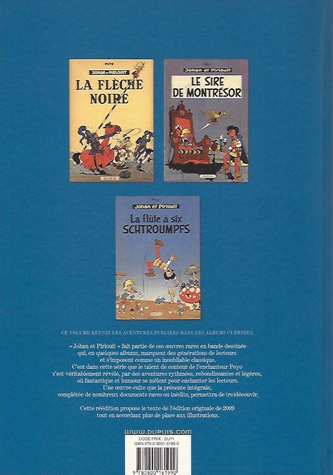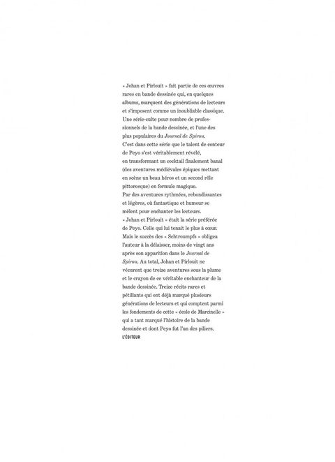 Défenseurs du Roy, de la veuve et de l'orphelin, Johan et Pirlouit s'opposent aux brigands, traîtres et autres vassaux félons qui arpentent les cours du Moyen Âge. Et la malice tapageuse de l'un prend de plus en plus souvent le pas sur la combattante de l'autre. Pirlouit, personnage principal de ces aventures ? Presque... car apparaissent alors de mystérieux lutins à la peau bleue : les Schtroumpfs ! Cette intégrale comprend : La flèche noire (tome 7) Les milles écus (histoire courte) Le sire Montrésor (tome 8) Les anges (histoire courte) La flûte à six Schtroumpfs (tome 9)
