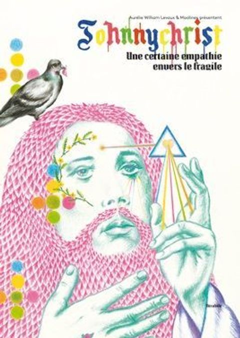 Johnnychrist: derrière ce nom, plein de promesses, se cache le nouveau projet de Moolinex et Aurélie William Levaux, un livre réalisé à plusieurs mains, un travail singulier et sans réel équivalent. Car dans ce grand format tout en couleurs, Aurélie William Levaux et Moolinex se sont comme fondus en une troisième personne, le Johnnychrist du titre, artiste inclassable et personnalité borderline, et inventeur d’un mouvement (dont il semble être le seul membre), le PRISME. Ce personnage complexe, dans la peau duquel se sont glissés les deux auteurs (et dont le livre dresse un portrait en creux), produit alors une œuvre flirtant perpétuellement avec le ringard et le beau, le mauvais goût et la recherche. Perclues d’obsessions et de visions affolantes, les images offertes ici font parfois rire, mettent aussi mal à l’aise, et, par leur étrange radicalité, obligent toujours le lecteur à prendre position – car en allant loin, très loin, repoussant dans ses derniers retranchements des notions comme le goût, alors, comme par magie, Johnnychrist touche au beau. «L’art c’est beau disait Alphonse Daudet, Et il a pas tort, dit Johnnychrist par l’intermédiaire du PRISME.»