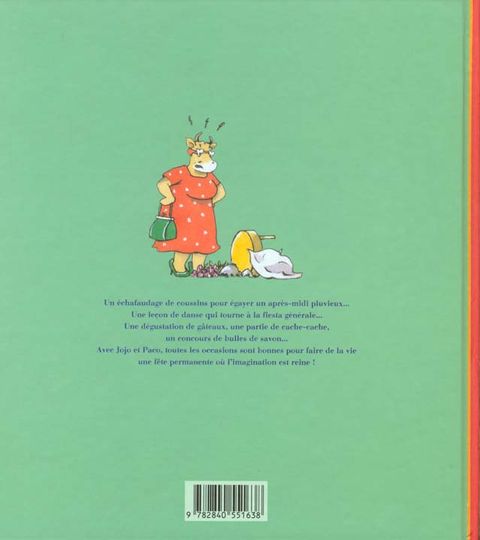 Un échafaudage de coussins pour égayer un après-midi pluvieux. Une leçon de danse qui tourne à la fiesta générale. Une dégustation de gâteaux, une partie de cache-cache, un concours de bulles de savon. Avec jojo et paco, toutes les occasions sont bonnes pour faire de la vie une fête permanente où l'imagination est reine !.