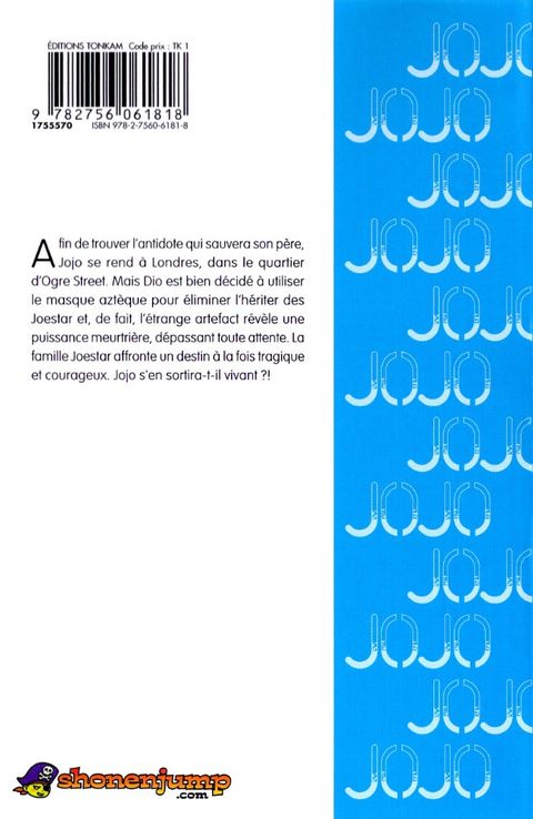 Afin de trouver l'antidote qui sauvera la vie de son père, Jojo se rend à Londres, dans le quartier d'Ogre Street. Mais Dio est bien décidé à utiliser le masque aztèque pour éliminer l'hériter des Joestar. En effet, l'étrange artefact se révèle capable de tuer. Le destin tragique de la famille Joestar ne fait que commencer. Jojo s'en sortira-t-il vivant ?
