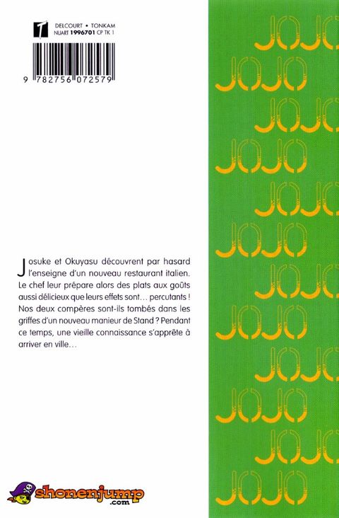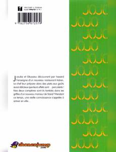 Josuke et Okuyasu découvrent par hasard l’enseigne d’un nouveau restaurant italien. Le chef leur prépare alors des plats aux goûts aussi délicieux que leurs effets sont… percutants ! Nos deux compères sont-ils tombés dans les griffes d’un nouveau manieur de Stand ? Pendant ce temps, une vieille connaissance s’apprête à arriver en ville…