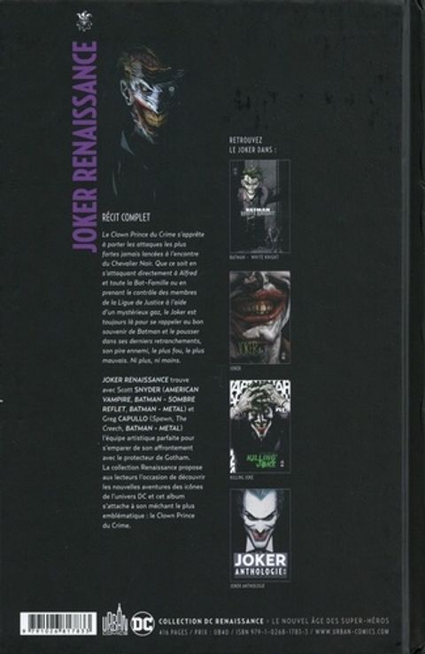 Le Clown Prince du Crime s'apprête à porter les attaques les plus fortes jamais lancées à l'encontre du Chevalier Noir. Que ce soit en s'en prenant directement à Alfred et toute la Bat-Famille ou en prenant le contrôle des membres de la Ligue de Justice à l'aide d'un mystérieux gaz, le Joker est toujours là pour se rappeler au bon souvenir de Batman et le pousser dans ses derniers retranchements, son pire ennemi, le plus fou, le plus mauvais. Ni plus, ni moins. Contenu : équivalent des tomes 3 et 7 de la série en DC Renaissance (#13-17 + #35-40)
