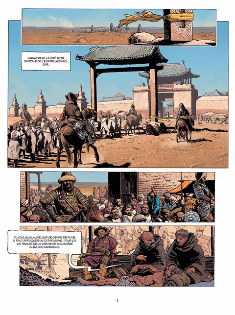 Prisonnier des Mongols à Karakorum, la cité d'or, le moine franciscain Guillaume assiste à l'arrivée d'un nouveau convoi qui contient son frère Renaud et le terrible Aleksandar. Alors que Renaud est exécuté par les Mongols, Guillaume et Aleksandar empêchent l'assassinat du Grand Khan, qui les chargent d'une mission de paix auprès de Frédéric II, empereur du Saint Empire, surnommé la « Stupeur du Monde ».