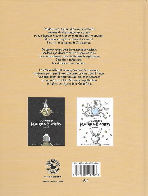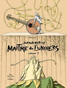 Comme on l'apprend dans le premier volume de la série, rien ne va plus dans l'univers créé par Juanalberto. Certains des peuples y vivant sont en conflit entre eux, notamment à cause des Inhibiteurs Photoniques, des êtres obsédés par la domination. Syprisse, une jeune fille appartenant au peuple nommé les Naturels, s'est associée à Limérius, un Néo-Oraliste, pour faire le voyage vers la dimension où habitent leur créateur Juanalberto et sa compagne Victoria. Dans le présent volume, Juanalberto apprend à Limérius quelques secrets au sujet de la musique et de la littérature, pendant que Syprisse, restée dans la salle à manger pour s'enivrer de prygnaf, reçoit la visite inattendue d'un jeune scientifique, Ian, qui se déplace à l'aide de sa dernière invention, un téléporteur. Dans la dimension "naturelle" de l'univers, Krapch l'Inhiphot essaye de trouver, auprès des Evolutifs Aléatoires, des alliés pour détrôner leur maître Juanalberto. Il va de surprise en surprise, car ces derniers non seulement se distinguent beaucoup de l'idéologie de Krapch, mais sont beaucoup plus avancés que les Inhiphots sur plusieurs domaines, y compris celui de la maîtrise du temps. Remarquant que sa maison est le lieu d'accueil de plusieurs personnages qui s'y sont invités (les mystérieux Hector et Paul s'ajoutent à cet ensemble), Juanalberto décide de tous les réunir dans une salle de conférences, où ils prendront place sur des tribunes... intelligentes ! Un dernier tour de magie les amènera tous à un voyage qui constituera le sujet du prochain volume. On continue à philosopher, à se confronter à des mystères, à essayer de séduire, mais aussi à se chamailler... les créatures et leur créateur ont de la peine à trouver un terrain d'entente. Tout cela dans un univers haut en couleur, où le fantastique est monnaie courante. Bonus : le texte de ce troisième volume de Juanalberto Maître de l'Univers recèle plusieurs allusions à l'univers de Tintin.