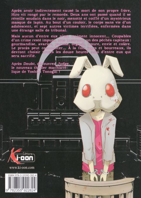 Après avoir indirectement causé la mort de son propre frère, Hiro vit rongé pair le remords. Deux ans ont passé quand il se réveille soudain dans le noir, menotté et coiffé d'un mystérieux masque de lapin. Au bout d'un couloir, le corps sans vie d'un adolescent, et sept antres victimes terrifiées, enfermées dans une étrange salle de tribunal. Mais aucun d'entre eux n'est vraiment innocent. Coupables d'un crime resté impuni, tous incarnent des péchés capitaux : gourmandise, avarie , paresse, orgueil, luxure, envie et colère. Le procès peut commencer. A la fois juges et bourreaux, ils devront choisir toutes les douze heure celui d'entre eux qui sera sacrifié.
