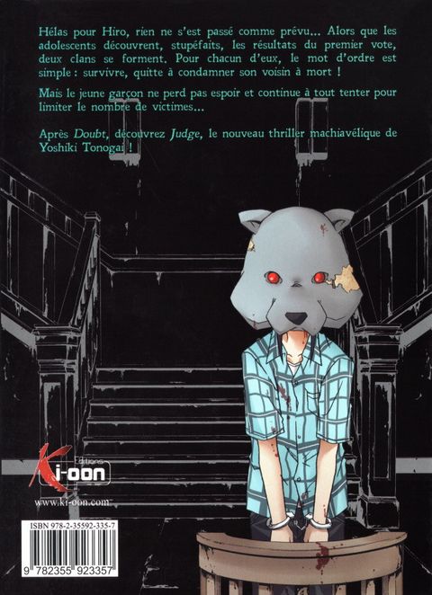 Hélas pour Hiro, rien ne s'est passé comme prévu... Alors que les adolescents découvrent, stupéfaits, les résultats du premier vote, deux clans se forment. Pour chacun d'eux, le mot d'ordre est simple : survivre, quitte à condamner son voisin à mort ! Mais le jeune garçon ne perd pas espoir et continue à tout tenter pour limiter le nombre de victimes...Après Doubt, découvrez Judge, le nouveau thriller machiavélique de Yoshiki Tonogai !