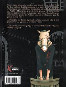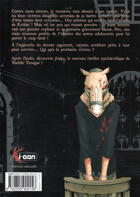 Deux exécutées... Une solution qui semble faire l'affaire de Ryûhei ! Mais tel est pris qui croyait prendre : le jeune homme voit son pistolet exploser et se retrouve gravement blessé. Pire, une main inconnue profite de l'absence des autres adolescents pour lui porter le coup fatal ! A l'approche du dernier jugement, certains semblent prêts à  tout pour survivre... Qui sera la prochaine victime ? Après Doubt, découvrez Judge, le nouveau thriller machiavélique de Yoshiki Tonogai !