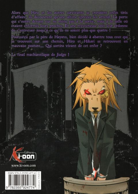 Alors que Hiro et les autres survivants se croyaient enfin tirés d’affaire, ils découvrent qu’une ultime épreuve les attend. La porte qui s’ouvre devant eux ne mène pas à la sortie, mais à la salle où étaient enfermés leurs proches. Et une mystérieuse voix leur ordonne de s’entretuer jusqu’à ce qu’ils ne soient plus que quatre ! Poursuivis par le père de Hayato, bien décidé à abattre tous ceux qui se trouvent sur son chemin, Hiro et Hikari se retrouvent en mauvaise posture… Qui sortira vivant de cet enfer ?