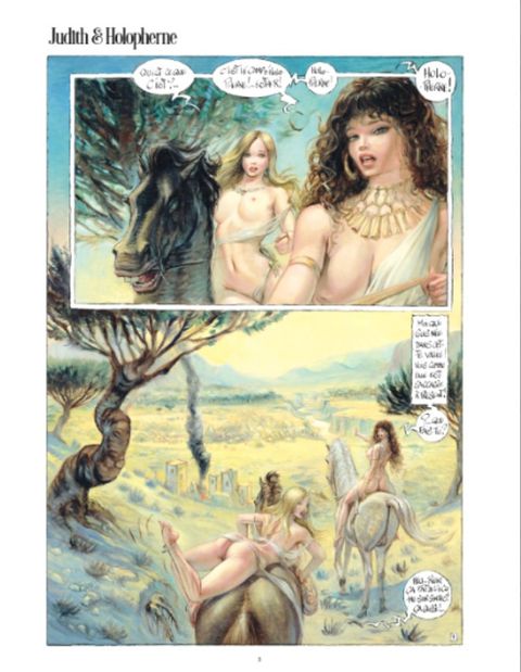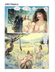 On oublie parfois combien la Bible recèle de passages sulfureux et d'héroïnes lascives. Riverstone puise dans cette matière intemporelle et livre deux récits de femmes fortes, aussi féroces que désirables. Chassée de sa belle-famille après deux mariages stériles, la jolie Thamara piège le patriarche Juda et lui donne des jumeaux dont descendra David, mythique roi d'Israël. Judith, quant à elle, assiste impuissante au sac de Béthanie par l'armée d'Holopherne. Une fois la nuit venue, elle se glisse dans la tente du général, le séduit puis lui tranche la gorge. De ces deux passages de l'Ancien Testament, Riverstone extraie toute la sève érotique et crée un monde de sexe et de violence, où les héros sont à la fois magnifiques et pitoyables. Encore un chef-d'œuvre pour cet artiste décidément à part de la bande dessinée érotique.