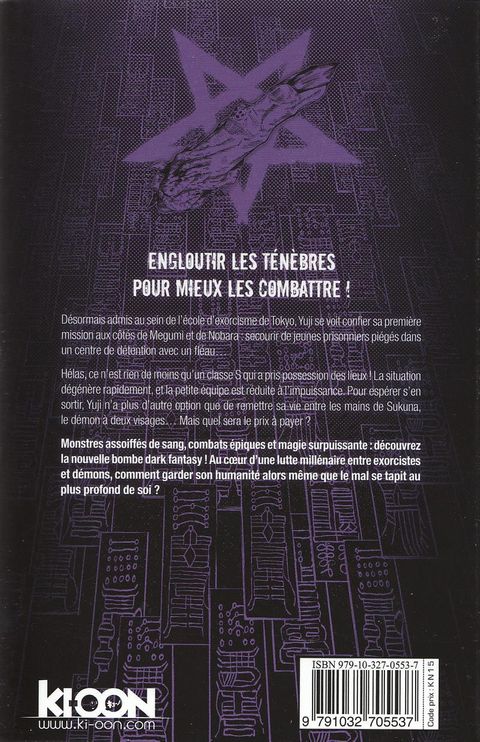 Chaque année au Japon, on recense plus de 10 000 morts inexpliquées et portés disparus. Dans la majorité des cas, ce sont les sentiments négatifs des êtres humains qui sont en cause. Souffrance, regrets, humiliation : leur accumulation dans un même endroit provoque des malédictions souvent fatales… C’est ce que va découvrir à ses dépens Yuji Itadori, lycéen et membre du club de spiritisme. Il ne croit pas aux fantômes, mais sa force physique hors du commun est un précieux atout pour les missions du groupe… jusqu’à ce que l’une d’elles tourne mal. La relique qu’ils dénichent, le doigt sectionné d’une créature millénaire, attire les monstres ! Le jeune homme n’hésite pas une seconde : il avale la relique pour conjurer le mauvais sort ! Le voilà possédé par Ryomen Sukuna, le célèbre démon à deux visages. Contre toute attente, Yuji réussit à reprendre le contrôle de son corps. C’est du jamais vu ! Malgré tout, il est condamné à mort par l’organisation des exorcistes… Une sentence qui ne pourra être repoussée qu’à une seule condition : trouver et ingérer tous les doigts de Sukuna afin d’éliminer la menace une fois pour toutes. Et pour ça, l’adolescent va devoir s’initier à l’art occulte et mystérieux de l’exorcisme ! Monstres assoiffés de sang, combats épiques et magie surpuissante : découvrez la nouvelle bombe dark fantasy ! Au cœur d’une lutte millénaire entre exorcistes et démons, comment garder son humanité alors même que le mal se tapit au plus profond de soi ?