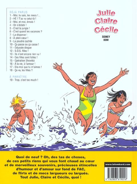 Ça va, ça va même très fort pour le sémillant trio de super nanas de la BD. Toujours aussi folles de beaux mecs et toujours aussi gourmandes de nouvelles expériences, Julie, Claire et Cécile reviennent dans une suite de savoureux gags. Les années ont beau défiler, Julie, Claire et Cécile restent irrésistiblement pétillantes de jeunesse. Ni les inévitables déceptions amoureuses, ni les petits tracas quotidiens, ni les contrariétés de la vie professionnelle, ni le spectacle souvent désolant de notre société ne semblent capables d'entamer l'optimisme et le dynamisme de ces trois jolies filles éclatantes de joie de vivre. Julie est plus que jamais résolue à démontrer à tous les garçons de la terre - aux plus à son goût surtout - que les brunes ne comptent évidemment pas pour des prunes. Claire ne recule devant aucun effort pour enfin trouver la recette miracle qui lui assurera l'impact d'une blonde explosive. Comme une fleur en quête de papillons, Cécile, la rousse, sème à tout vent les attraits dont la nature l'a dotée. Bref, entre elles et les mecs qui peuplent leur environnement, c'est tout à la fois «Loft Story» et «L'Ile de la Tentation» avec, en plus, une bonne dose d'humour et de saine franchise. Bien sûr, le monde qui les entoure leur rappelle chaque jour qu'on ne peut vivre d'amour et d'eau fraîche. Chacune se prépare donc un métier idéalement adapté à ses aspirations et à son tempérament : valorisant, bien payé et praticable en toute liberté ! Comment aussi ne pas s'indigner face aux injustices de notre société ? Comme toutes les filles libérées de leur génération, Julie, Claire et Cécile sont de toutes luttes tantôt pro et tantôt anti. jusqu' à ce qu'une belle et mâle gueule d'amour vienne émoustiller leur féminité.