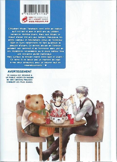 Alors que Misaki se réjouit d'avoir été embauché aux éditions Marukawa, les petits cadeaux et félicitations venus de l'extérieur ( Ijûin, Sumi. ) ne font qu'attiser la jalousie d'Usami. Ce dernier décide de l'enlever pendant son sommeil et de l'emmener dans une de ses résidences secondaires où le jeune éditeur fera une rencontre plutôt inattendue. Qui plus est, les hostilités entre Usami et Ijûin semblent officiellement ouvertes ! Ce tome 15 ne laisse pas un moment de répit à nos deux amoureux, pour un volume tout en rebondissements !