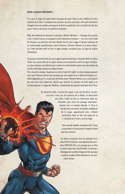 La Ligue de Justice a disparu, vaincue par un mystérieux Syndicat du Crime débarqué d’une autre dimension. Ce dernier revendique désormais le contrôle de la Terre et intime l’ordre aux super-vilains de se rassembler sous leur bannière. Le dernier espoir d’un monde en déroute ? Lex Luthor ! (Forever Evil 1-4, Justice League 24-25, Justice League 23.4 : Secret Society, Justice League of America 7.4: Black Adam)