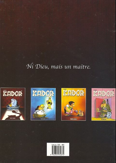 Le dernier tome de Kador réunit les pages hebdomadaires que BINET a publiées dans le Matin-Magazine durant la saison 80-81. Les Bidochon, couple de Français trop moyens, ont de plus en plus de mal à maîtriser leur Kador, chien philosophe d'un niveau intellectuel tellement élevé que, entre lui et ses maîtres, l'incommunicabilité des êtres se palpe à l'oeil nu. BINET impose avec autorité son style personnel d'humour et de non-sens. A lire en mangeant des croquettes.