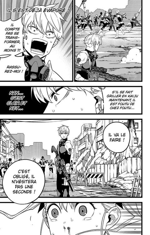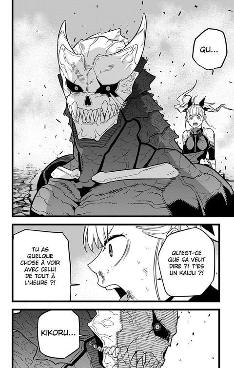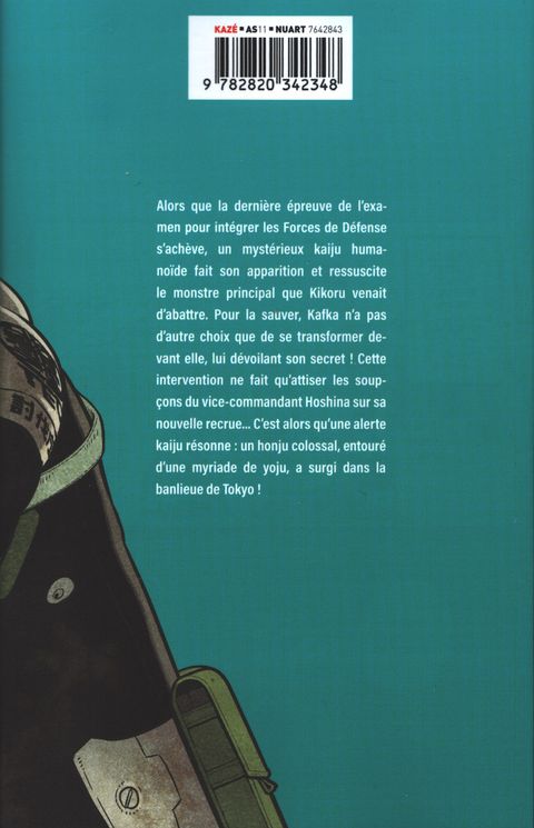 Alors que la dernière épreuve de l'examen pour intégrer les Forces de Défense s'achève, un mystérieux kaiju humanoïde fait son apparition et ressuscite le monstre principal que Kikoru venait d'abattre. Pour la sauver, Kafka n'a pas d'autre choix que de se transformer devant elle, lui dévoilant son secret ! Cette intervention ne fait qu'attiser les soupçons du vice-commandant Hoshina sur sa nouvelle recrue... C'est alors qu'une alerte kaiju résonne : un honju colossal, entouré d'une myriade de yoju, a surgi dans la banlieue de Tokyo !