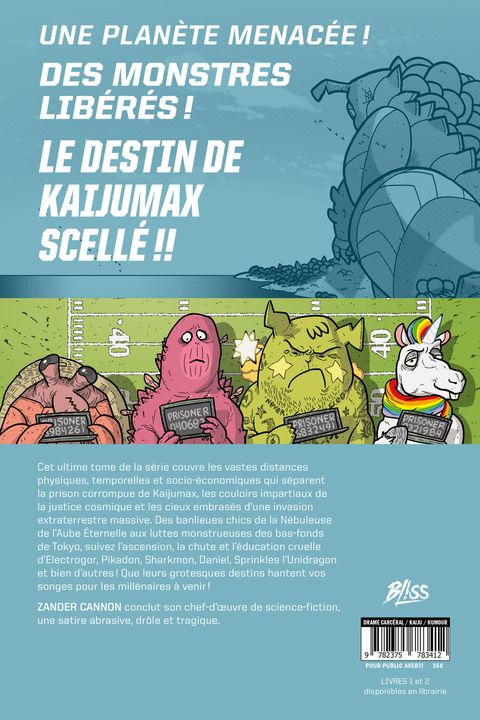 Cet ultime tome de la série, couvre les vastes distances physiques, temporelles et socio-économiques qui séparent La prison corrompue de Kaijumax, les couloirs impartiaux de la justice cosmique et les cieux embrasés d'une invasion extraterrestre massive. Des banlieues chic de Nebula de l'Aube Éternelle aux luttes monstrueuses des bas-fonds de Tokyo, suivez l'ascension, la chute et l'éducation cruelle d'Electrogor, Pikadon, Sharkmon, Daniel, Sprinkles l'Unidragon et bien d'autres ! Que leurs grotesques destins hantent vos songes pour les millénaires à venir !