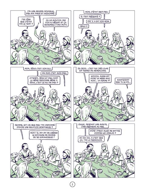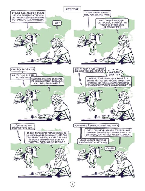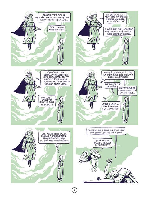 Dieu n'en a que faire des Anglois ou du royaume de France et la Pucelle a tout compris de travers. Il s'incarne alors en lui-même, un vieil homme barbu (ce qui a le don de décevoir Jeanne qui s'attendait à un bel homme bien musclé) et décide d'accompagner la jeune fille dans son périple, avant tout pour tenter de tempérer son ardeur. Mais il se fera bien entendu dépasser par la ferveur de Jeanne...