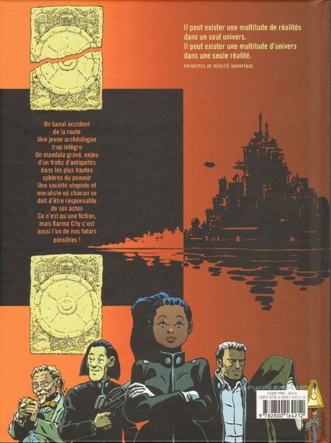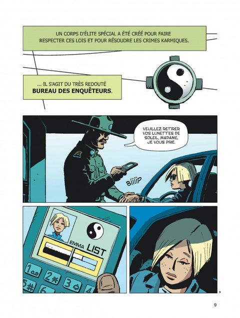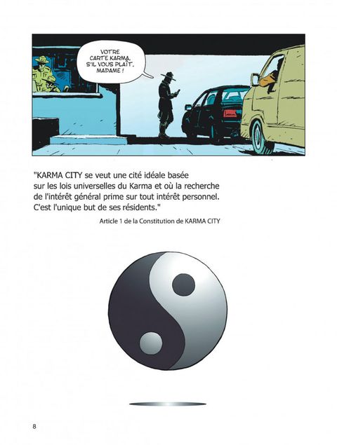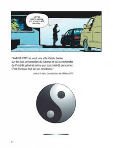 Karma City : une ville vertueuse régie par les lois universelles du karma, où l'intérêt général primerait toujours sur l'intérêt particulier. Dans une société dirigée par le concept de karma, Emma List se présente aux portes de la "zone blanche" de la capitale. Autorisée à entrer malgré un karma un peu négatif, elle fait un AVC quelques minutes plus tard et s'écrase avec son véhicule. Ce qui ne semblait être qu'un rapport de routine pour les agents Cooper, Napoli et Asuki va pourtant se transformer en enquête de vaste envergure. Car Emma, chercheuse en paléontologie, s'était installée en zone grise à la recherche d'un mandala gravé, témoignage de l'existence de sociétés pré-karmiques. Or fouiller ces dangereux sables mouvants exploités par les industriels n'est pas sans danger... La brigade finit par retrouver un corps dans la zone, le shérif local a pris la fuite, et même leur supérieur semble impliqué... Cette société qui érige le bien et l'intérêt général comme règle de vie a peut-être atteint ses limites... Une nouvelle série tout à la fois policière et futuriste, au scénario plein de suspense !