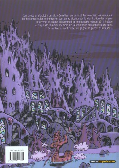 Un petit démon au pays des anges maléfiques Karma est un diablotin qui vit à Outrelieu, un pays où les zombies, les vampires, les fantômes et les monstres en tout genre vivent sous la domination d'anges cruels et tyranniques qui leur mènent une lutte sans merci. Grâce à Noé, un barqueux créature à tête humaine et à corps de barque , il traverse les brumes du sommeil qui séparent Outrelieu de notre monde. Là, il rejoint le cirque de Zombini, homme affable mais également membre très actif de la résistance aux oppresseurs ailés. Peu de temps après, Zombini est enlevé. Karma et Vlad, un vampire volant qui ne supporte pas la vue du sang, décident de retourner à Outrelieu pour le délivrer. C'est donc sur les frêles épaules de ces deux créatures naïves que repose l'issue de la guerre d'Outrelieu.