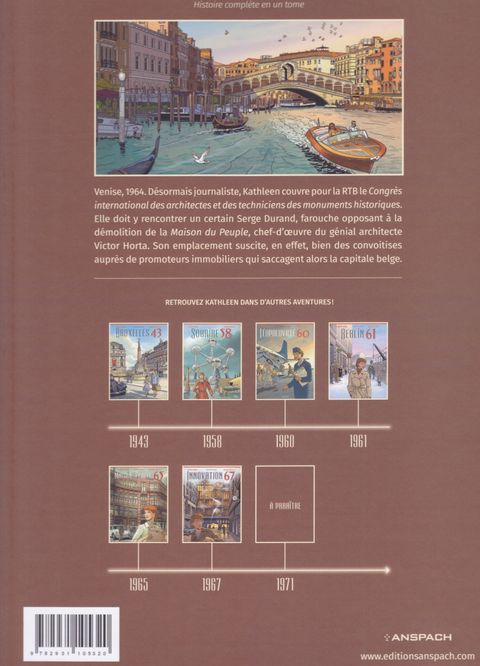 Venise, 1964. Désormais journaliste à la RTB, Kathleen couvre le Congrès International des Architectes et des Techniciens des Monuments Historiques. Elle doit y rencontrer un certain Serge Durand, farouche opposant à la démolition de la Maison du Peuple, chef d’oeuvre du génial architecte Victor Horta. Son emplacement suscite, en effet, bien des convoitises auprès des promoteurs immobiliers qui saccagent alors la capitale belge. Durand lui a promis des révélations fracassantes, mais sa mort aussi soudaine que suspecte le fait taire Maisondu Peuple 65 à tout jamais. De retour à Bruxelles, Kathleen est contactée par sa veuve qui lui explique alors que son mari avait mis la main sur le testament de… Victor Horta. Cependant, le facétieux génie y a adjoint un rébus basé sur quelques-unes de ses réalisations les plus admirables. Aidée par Antoinette Legein, une professeure d’université, spécialiste de l’Art nouveau, Kathleen se lance dans un jeu de pistes haletant à travers Bruxelles. Arriveront-elles à sauver la Maison du Peuple et à faire cesser le massacre architectural de Bruxelles ?