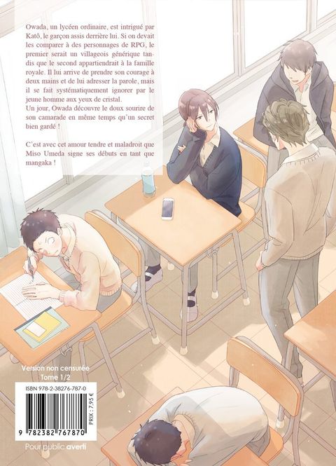 Owada, un lycéen ordinaire, est intrigué par Katô, le garçon assis derrière lui. Si on devait les comparer à des personnages de RPG, le premier serait un villageois générique tandis que le second appartiendrait à la famille royale.Il lui arrive de prendre son courage à deux mains et de lui adresser la parole, mais il se fait systématiquement ignorer par le jeune homme aux yeux de cristal.Un jour, Owada découvre le doux sourire de son camarade en même temps qu'un secret bien gardé !C'est avec cet amour tendre et maladroit que Miso Umeda signe ses débuts en tant que mangaka !