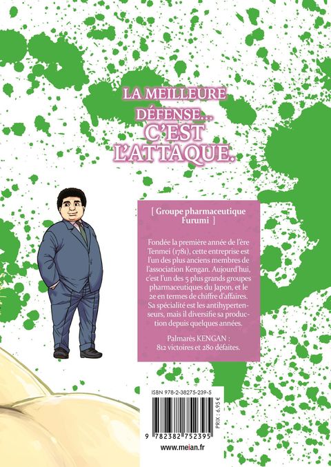 Groupe pharmaceutique FurumiFondée la première année de l'ère Tenmei (1781), cette entreprise est l'un des plus anciens membres de l'association Kengan. Aujourd'hui, c'est l'un des 5 plus grands groupes pharmaceutiques du Japon, et le 2e en termes de chiffre d'affaires. Sa spécialité est les antihypertenseurs, mais il diversifie sa production depuis quelques années.Palmarès KENGAN : 812 victoires et 28o défaites.LA MEILLEURE DÉFENSE... C'EST L'ATTAQUE.