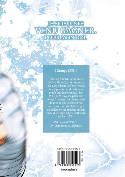 Groupe YAZUFondé au cours de la 22e année de l'ère Showa (1947), ce groupe a la particularité de s'être très tôt développé autour de la financeplutôt que du commerce. Son PDG, IIDA Takashi, passe son temps à voyager aux quatre coins du monde pour décrocher denouveaux contrats. Il développe actuellement ses activités en Asie du Sud-Est avec la bénédiction du roi Rama XIII.Palmarès KENGAN : 253 victoires et 104 défaites.JE SUIS JUSTE VENU GAGNER. POUR MON ROI.