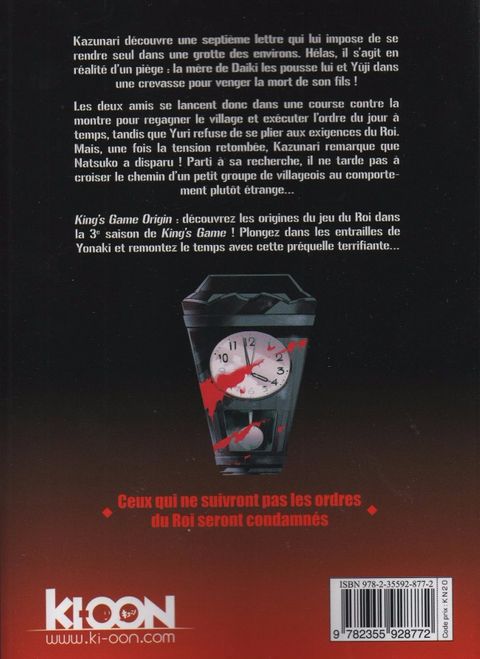 Après les premiers décès, une deuxième enveloppe noire arrive à Yonaki, porteuse d'une nouvelle consigne. Grâce au sacrifice de Ryûji, la mission semble accomplie, mais trois des frelons capturés pour le Roi meurent peu avant minuit. Et le lendemain matin, les corps de trois villageois sont retrouvés découpés en morceaux ! Alors que la panique s'empare du hameau, Kazunari et ses amis décident de parler du jeu du Roi aux adultes, qui ne les prennent pas au sérieux. Quant à la police, elle se révèle incapable d'identifier le coupable. C'est alors qu'une troisième lettre est découverte : elle ordonne à chaque habitant de faire brûler la somme de 100 000 yens, sous peine de mort. King's Game Origin : découvrez les origines du jeu du Roi dans la 3e saison de King's Game ! Plongez dans les entrailles de Yonaki et remontez dans le temps avec cette préquelle terrifiante.