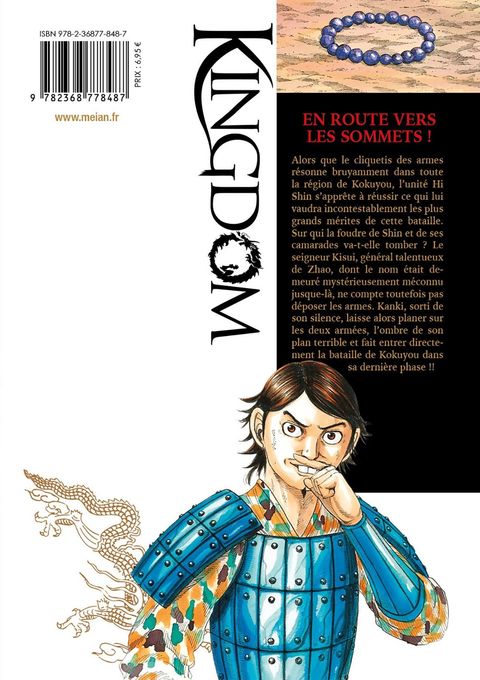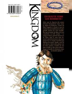 En route vers les sommets ! Alors que le cliquetis des armes résonne bruyamment dans toute la région de Kokuyou, l'unité Hi Shin s'apprête à réussir ce qui lui vaudra incontestablement les plus grands mérites de cette bataille. Sur qui la foudre de Shin et de ses camarades va-t-elle tomber ? Le seigneur Kisui, général talentueux de Zhao, dont le nom était demeuré mystérieusement méconnu jusque-là, ne compte toutefois pas déposer les armes. Kanki, sortie de son silence, laisse alors planer sur les deux armées, l'ombre de son plan terrible et fait entrer directement la bataille de Kokuyou dans sa dernière phase !!